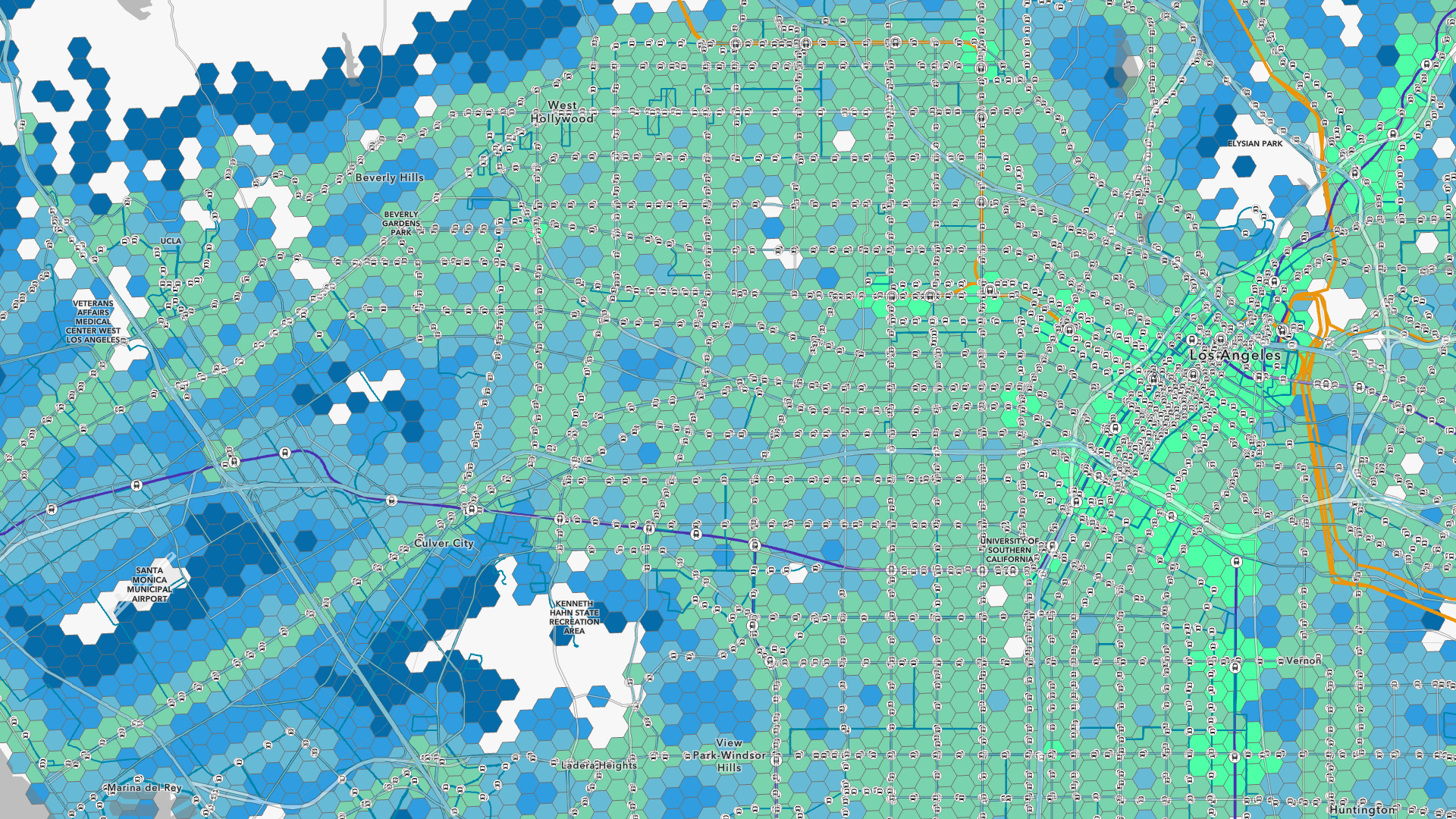 We’ve also run a more detailed transit accessibility score for all POI within Los Angeles metro region. We aggregated the scores to the tier 9 H3 hexagons to show how accessible specific regions of Los Angeles are when using public transportation.