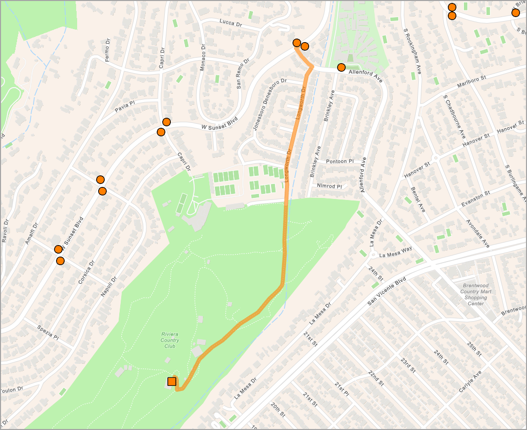These results highlight the venues in central Los Angeles as being relatively well served by transit. the outcome of these results can also help guide planning to increase service for venues in outlying areas that have lower scores. To further refine scoring, consider adding other attributes within the World Transit Stops layer to the model, such as weekly trip count and transit mode (bus, rail, light rail).