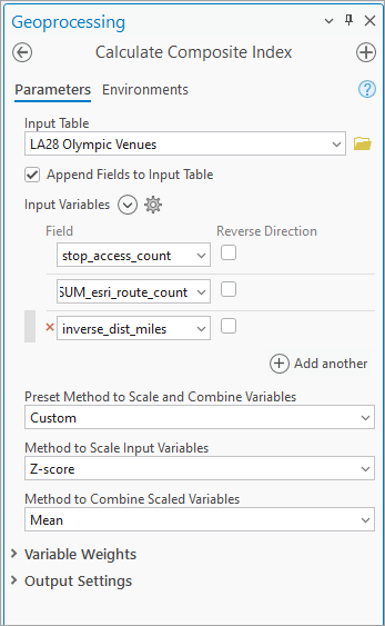 When configuring the Calculate Composite Index tool, we enabled the Append Fields to Input Table option to ensure the results were added directly to the Olympic venues POI layer.