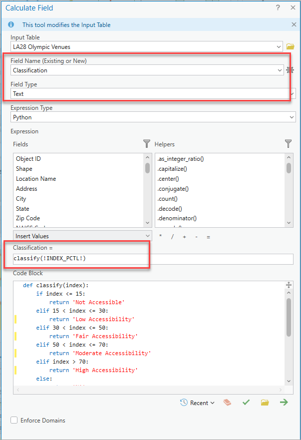We used the Calculate Field tool on the Olympic venues layer with the following if-else code block to assign the classifications: