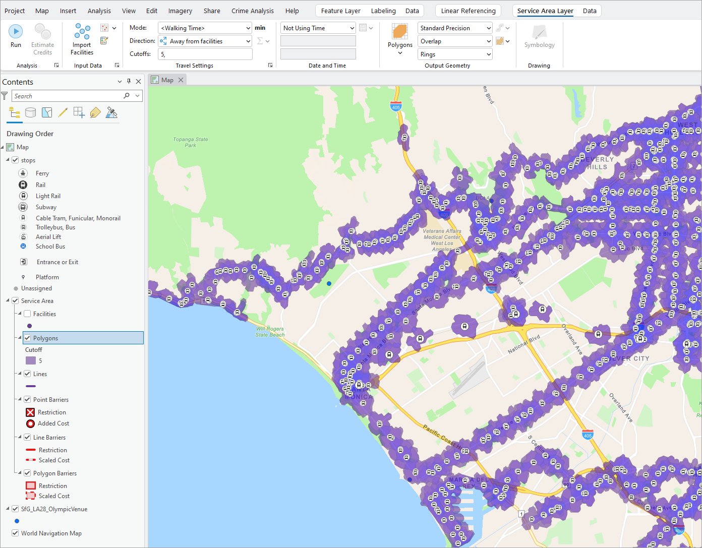 We used ArcGIS Pro’s Network Analysis tools to generate five-minute walk-time areas around each filtered transit stop. This step models realistic pedestrian access and helps determine which Olympic venues are within walking range of transit stops.