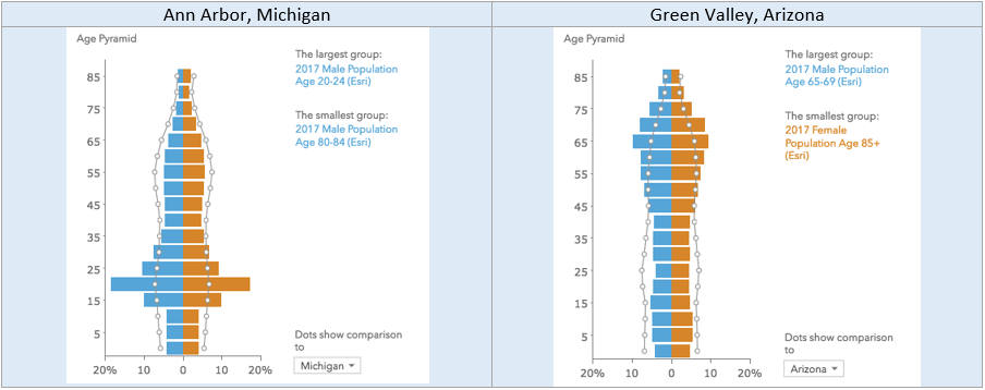 Age pyramid style visualization has been available in ArcGIS Business Analyst and can be used to quickly understand the population distribution in an area. For example, below are two Age Pyramids showing population distribution for Ann Arbor, Michigan and Green Valley, Arizona – depicting two completely different population distributions.
