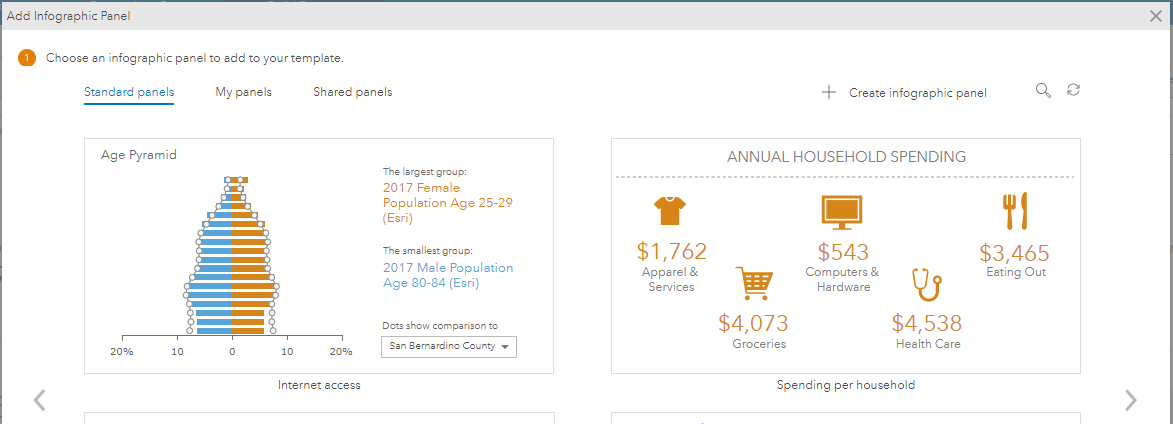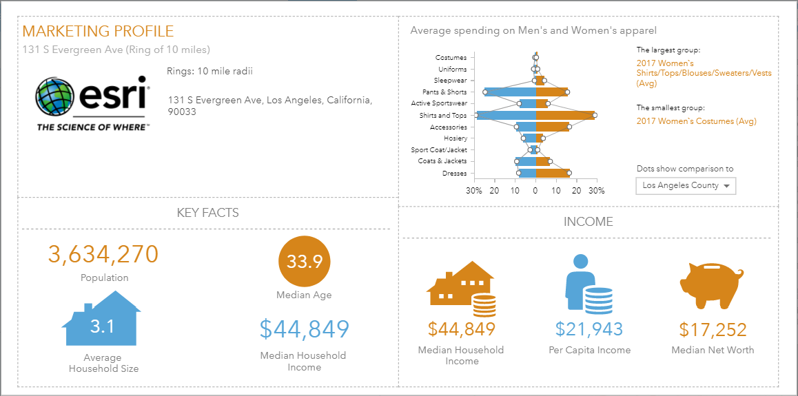 When done making the changes, click Apply to save the panel to the infographic template. You can then run the infographic template for a site to view the customized pyramid chart for a site – for example, the panel in the top right below shows spending on various men and women clothing categories for a site in Los Angeles. Each horizontal bar in the chart shows the average spending on a category of men’s and women’s apparel (in blue and brown respectively).