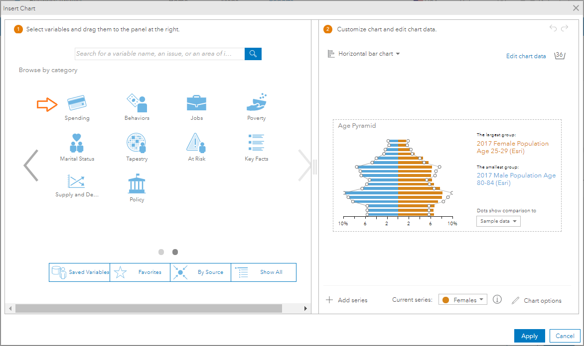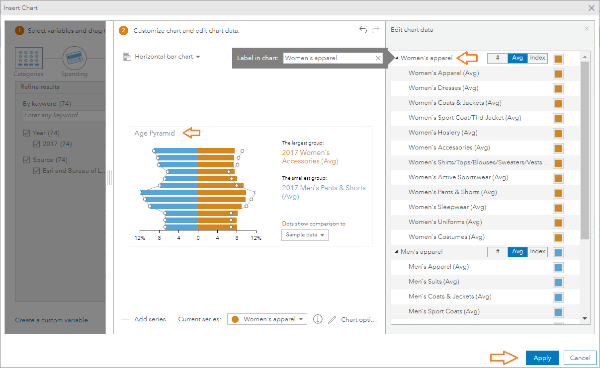 The Insert Chart dialog opens. Say, you want to compare the average spending on different types of Men’s and Women’s clothing. Under Browse by Category on the left, drill into Spending > Clothing.