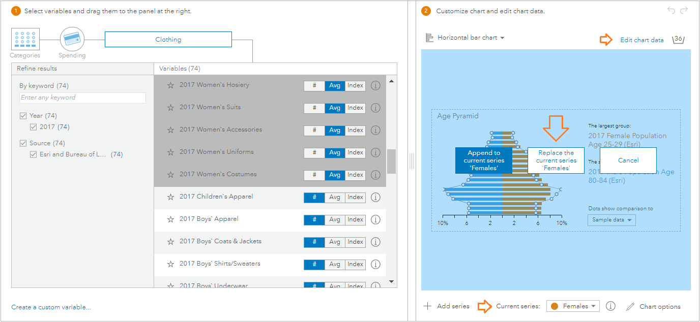 Select the spending variables pertaining to Women’s apparel. Drag and drop them into the chart data section on the right. Click Replace the current series, as you want to replace the variables in that series with these ones.