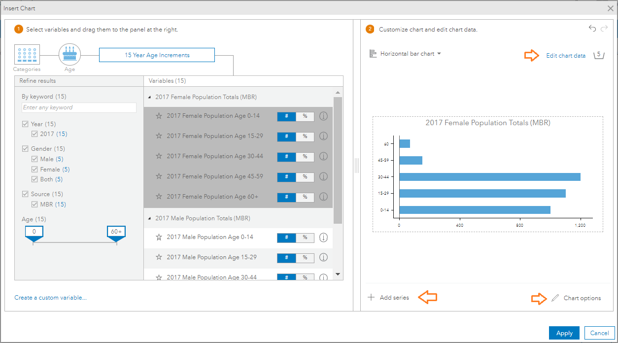 The Insert Chart dialog opens. On the left, drill into Age > 15 Year Age Increments, select all the variables under 2017 Female Population Totals (MBR) and drag and drop them into the chart data section on the right. Then click Add series.