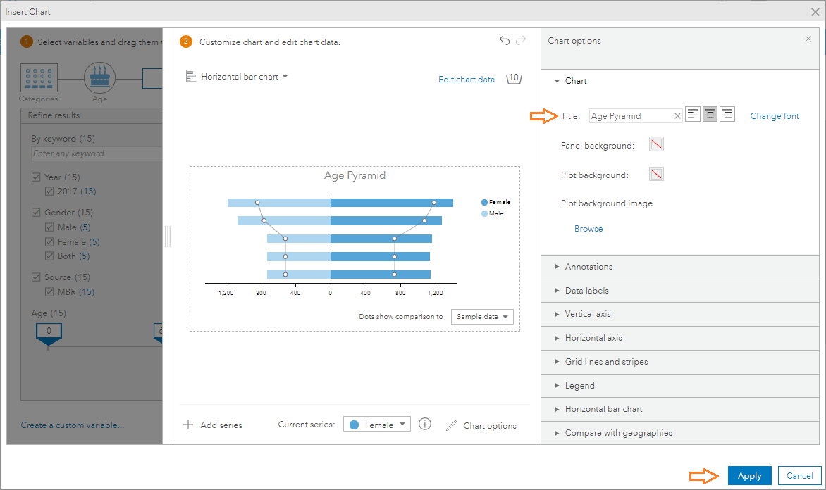 Now select all the variables under 2017 Male Population Totals (MBR) and drag and drop them into the chart data section – they will be added to the second series you just added. Under Edit chart data, name the series Female and Male. Click Chart options to expand that section, and under Horizontal bar chart, select the Bars on opposite sides checkbox.