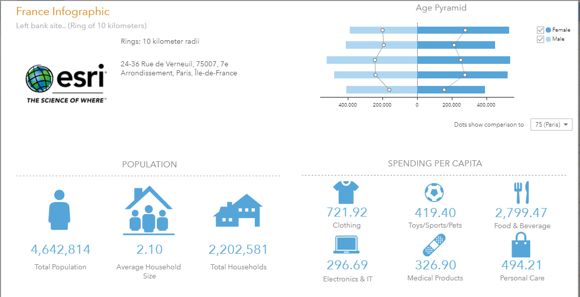 You can add additional infographic panels to the template, and save it. Run the infographic for a site to view your custom age pyramid chart for the site, with comparisons to geographies – for example, the panel in the top right below shows spending on population distribution by age for a site in Paris.