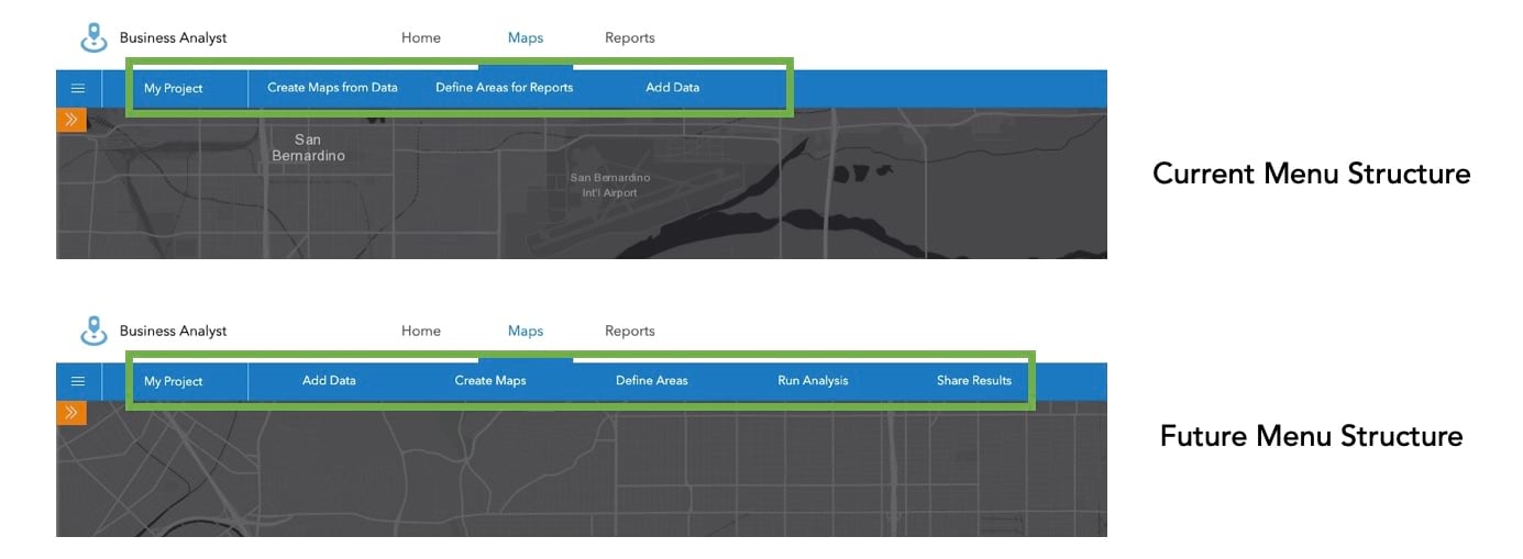 You will notice a new menu structure and renaming, along with two brand-new menus: Add Data, Create Maps, Define Areas, Run Analysis, Share Results. Common workflows are organized so you can navigate to them quicker. The new structure aligns the menu items in the order they are used in your work and organizes common workflows so you can navigate to them quicker. For example, you can add your own data for the project, create maps using your or Esri Demographic data, define analysis areas, run analysis, and share results with others.