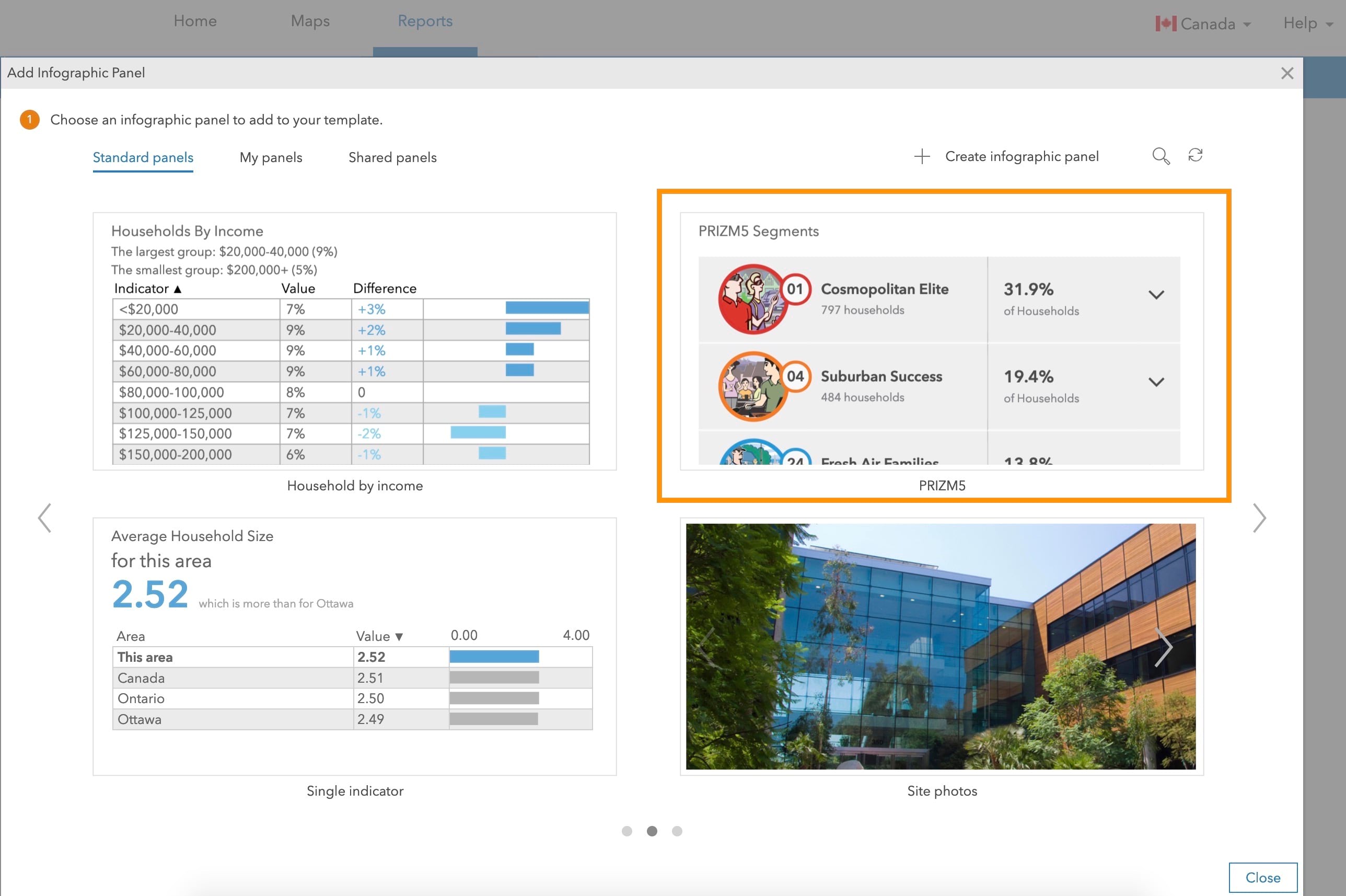 Determine top 3 consumer segments for any area in Canada using the PRIZM5 segmentation data. Simply add the PRIZM5 segments panel in your infographics and run it for any area.