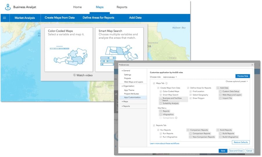 For example, let’s say you have two custom roles in ArcGIS Online. Users in the first custom role are occasional users (e.g. brokers) who primarily view maps, create sites, and run reports in the Business Analyst Web App. Users in the second custom role are power users who create and setup custom data and report templates so others in the organization can use them. To simplify the web app experience for the occasional users, the organization’s admin can enable only the mapping, site creation, and report running workflows and hide all other workflows. Similarly, for the power users, the admin can keep all the workflows or enable only the Custom Data Setup and Build workflows for Reports and Infographics and hide Color-coded Maps, Smart Map Search, and Business and Facilities Search.