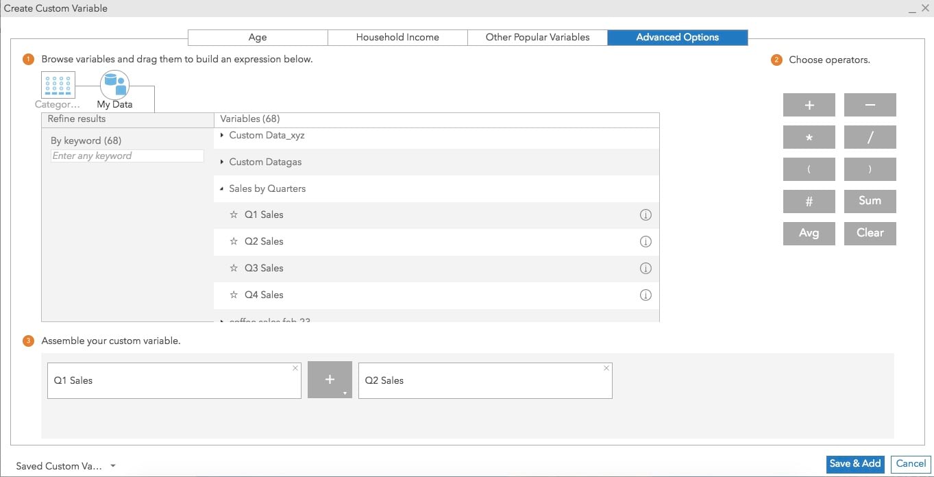 Calculate derived variables from your own data variables which are brought in using the Custom Data Setup workflow. For example, let’s say you have quarterly sales variables (e.g. Q1 sales, Q2 sales) added in BA Web as custom data. You will be able to create a custom variable by adding Q1 and Q2 sales to determine the sales for the first half of the year or by subtracting Q2 sales from Q1 to determine quarterly sales change.