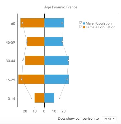 - Create custom age pyramids. For example, use the Population by Age distribution variables for France and create an age pyramid to understand male and female population distribution by age in one view.