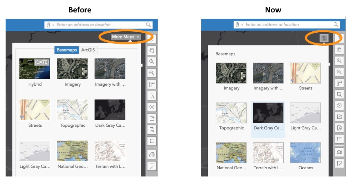 You will also notice that the More Maps button is replaced by a Basemaps icon to provide an easier way for changing basemaps. The experience of adding data from ArcGIS Online will continue to be available from the Add Data menu along with other options for bringing data in the BA Web App.
