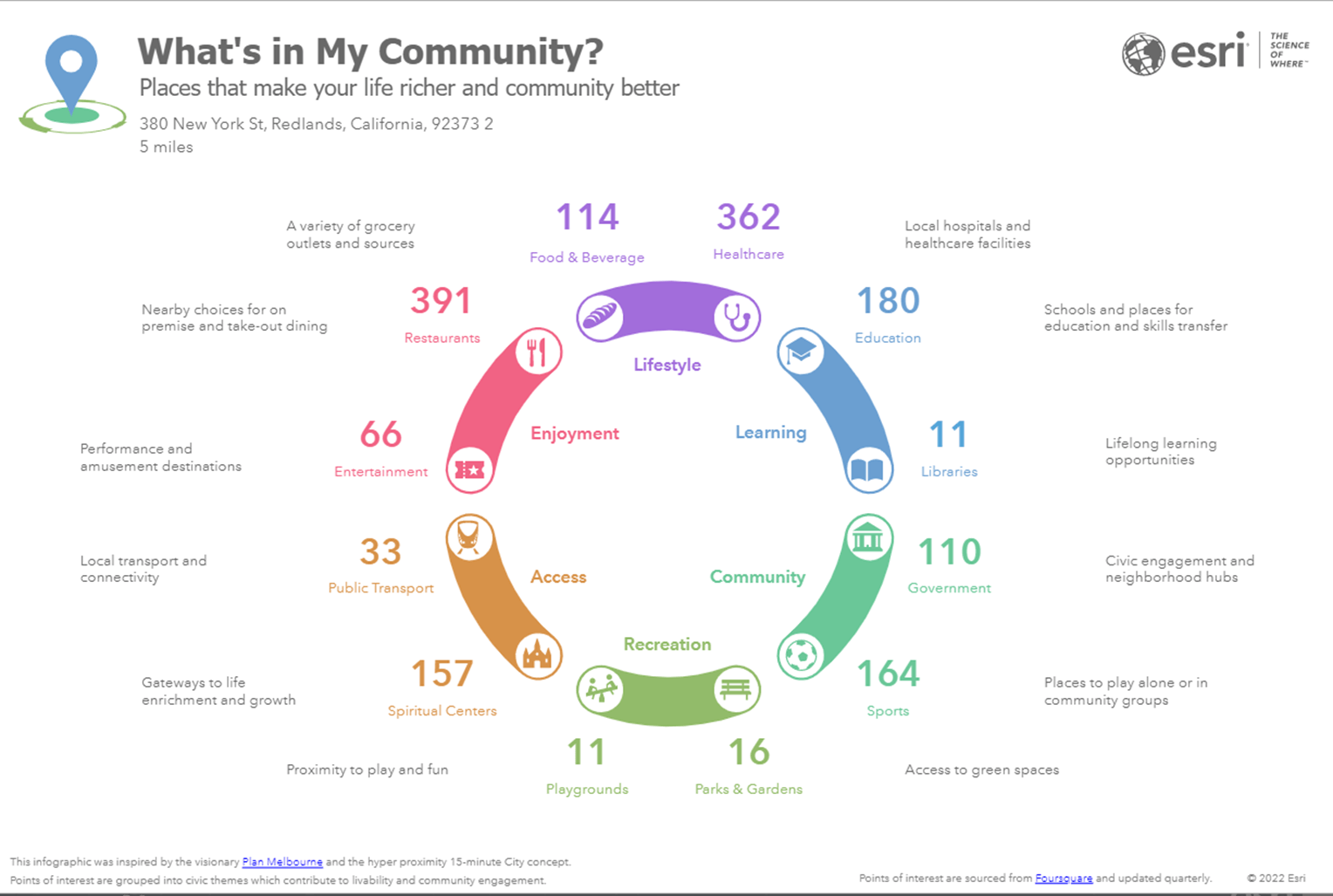 Neighborhood matters, and it is natural for people to want to learn more about the community they belong to. Inspired by the visionary Plan Melbourne and the hyper proximity 15-minute city concept, we designed a new infographic template called “What’s in My Community?” This infographic helps you identify nearby places that make your life richer and your community better, with information on points of interest in your selected neighborhood, such as grocery stores, hospitals, public transport, parks, playgrounds, and more. The infographic will be available for the USA as well as other countries.