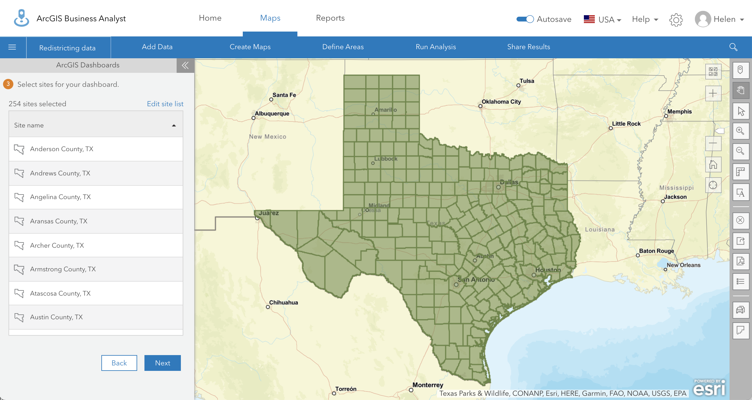 In September of this year, we created an easy three-click workflow where users can share sites, maps, and infographics via ArcGIS Dashboards. Previously, you were only able to select up to 100 sites. We listened to your feedback, and you can now select up to 500 sites. In the U.S., this enhancement allows you to create complete county-based dashboards for any state.