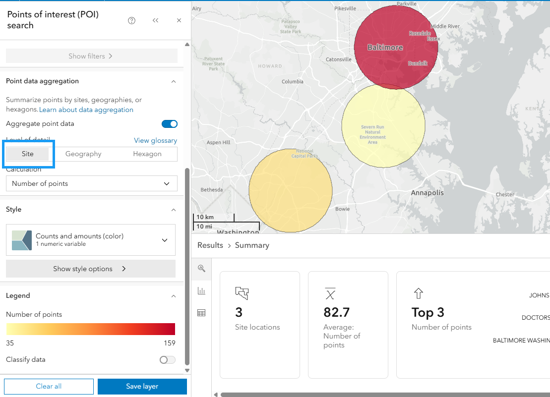 Now, after running a POI search, you can perform dynamic on-the-fly aggregation and visualization of points by sites, hexagons, or geographies. The option can be used to create a map of areas that summarizes the count of points or other numeric attributes present in the chosen POI data source.