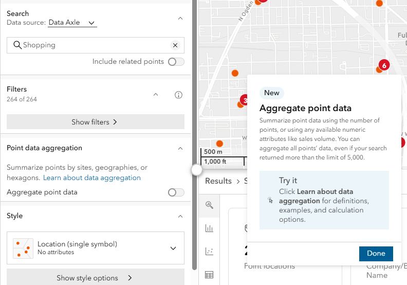 When a POI search is performed for the first time after the release, a coach mark will be seen to introduce point data aggregation. The Learn about data aggregation link can be used to launch in-app documentation for more information.