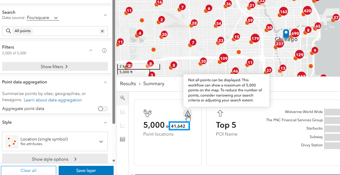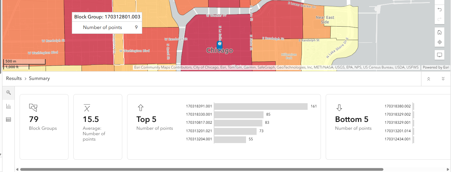 Additionally, when using the new point data aggregation, the Results pane updates with a summary, histogram, and table. The table only shows the geography level and measure value; individual POI are not listed.
