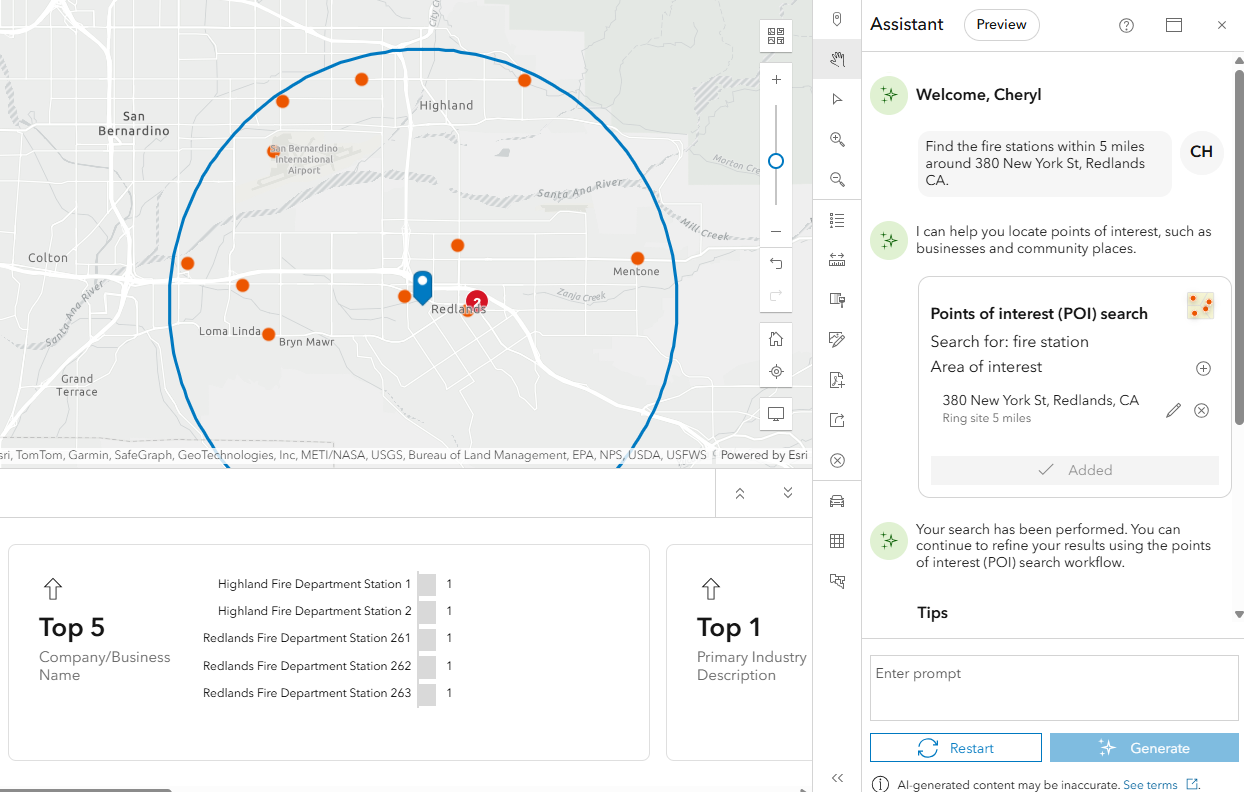 For example, you can use a prompt like “Find the fire stations within 5 miles around 380 New York St, Redlands CA.” In two clicks, the site and map are created for you.