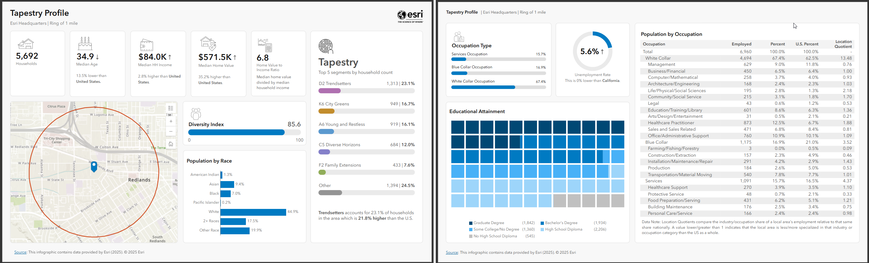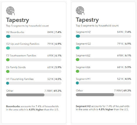 A new Standard infographic is available for Tapestry Profile, replacing the previous version. This older version can still be found in the Gallery as Tapestry Profile Legacy.