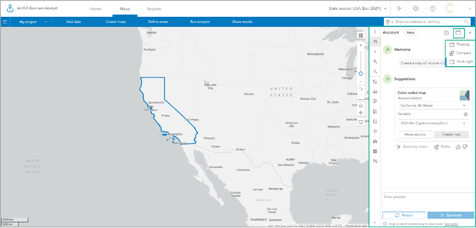 Additionally, the assistant now offers multiple docking options, enhancing organization and providing users with more flexible viewing choices. After generating results, you will see the assistant automatically docked in the right side of the app. Use the Display options to change the position from Docked to Compact or Floating. When using Compact or Floating, you can drag the assistant to your desired location on the screen.