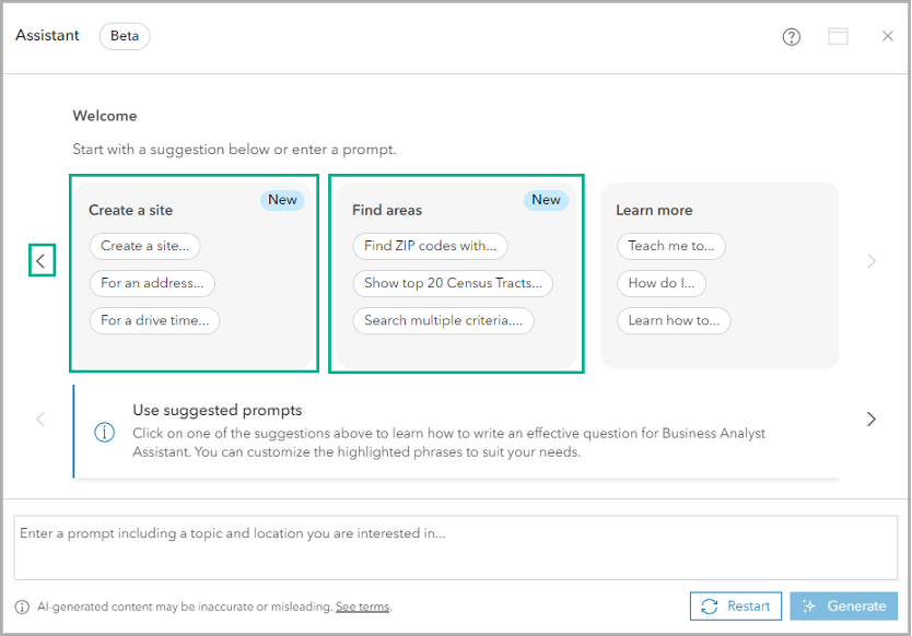 The most recent update expands the capabilities of Business Analyst Assistant (Beta), which now supports smart map search and find location workflows. To perform these workflows, use the Next button on the Assistant window and check out the new Create a site and Find areas prompts. The Create a site prompt suggests creating a map that highlights areas based on variable values.