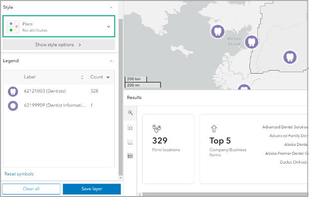 Take customization even further with new Places icons available for map styling. In the Style section, use the Places map style to apply unique point-based symbols based on location type. These new icons are the same icons used in the ArcGIS Places API. For this release, you can access the new Places map styling when working with Data Axle, SafeGraph, and Foursquare data sources.