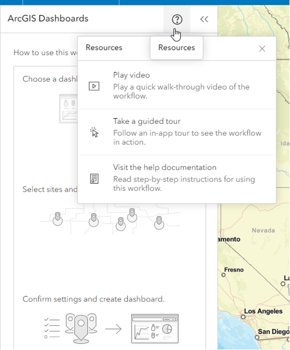 Need access to documentation and guidance while using the workflow? No worries! In our redesigned workflows, we have incorporated a Resources menu for quick access to documentation and guided tours under the Maps tab. For example, this menu has been added to the ArcGIS Dashboards workflow: