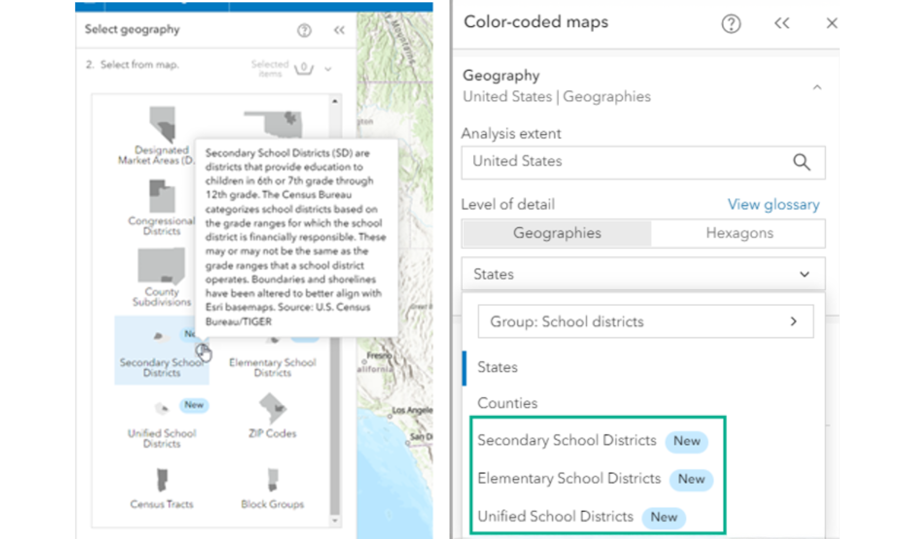 In addition to the wealth of data enhancements available in this update, the Business Analyst team has introduced even more datasets and boundaries to explore. We have added three geography levels for school districts to our collection of authoritative geographic boundaries: Unified School Districts, Elementary School Districts, and Secondary School Districts. You can use the Info icon in the select geography workflow to see a detailed description of each level in the in-app glossary.