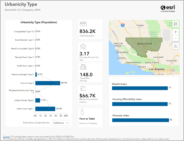 We are introducing a new Gallery template: Urbanicity Type. This infographic uses the new Esri Urbanicity Type dataset. Urbanicity refers to the degree of urbanization in a specific area ranging from highly urban environments (like big cities) to rural settings.