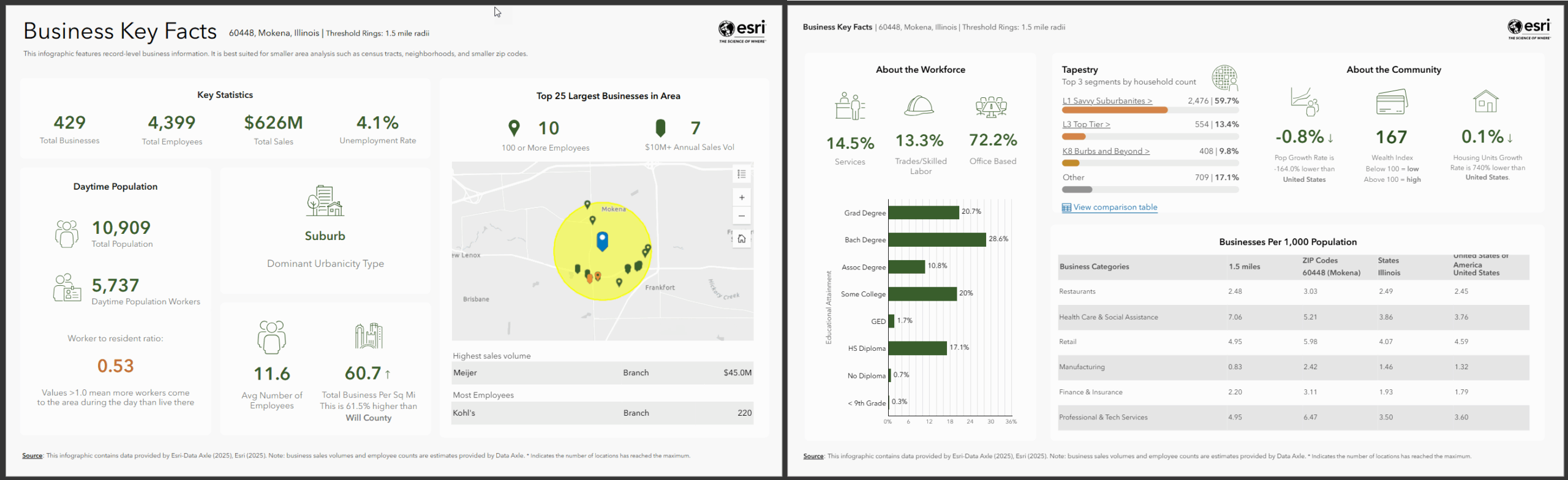 This two-page Standard infographic template provides a comprehensive overview of business data for your site. It contains demographic and points of interest data provided by Esri and Data Axle from the Esri Updated Demographics and ArcGIS Places datasets. Variables included in the template present information on key business statistics, the largest businesses in the area, the daytime population, the workforce, and the community. This infographic may be useful for economic developers performing hyper-local analysis.
