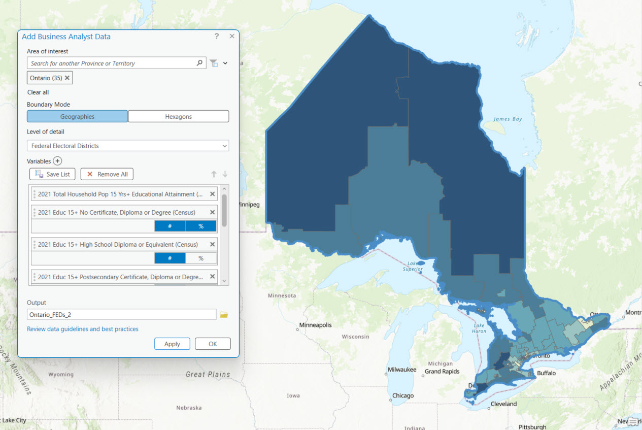 If you happen to have ArcGIS Business Analyst Pro with Canada data, here’s an example output containing education variables enriched to federal electoral districts for the province of Ontario.