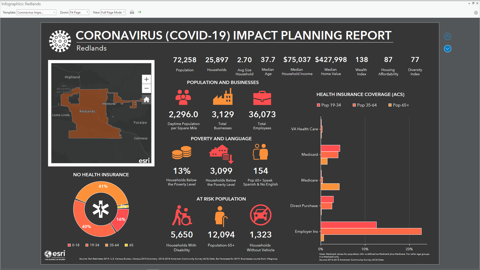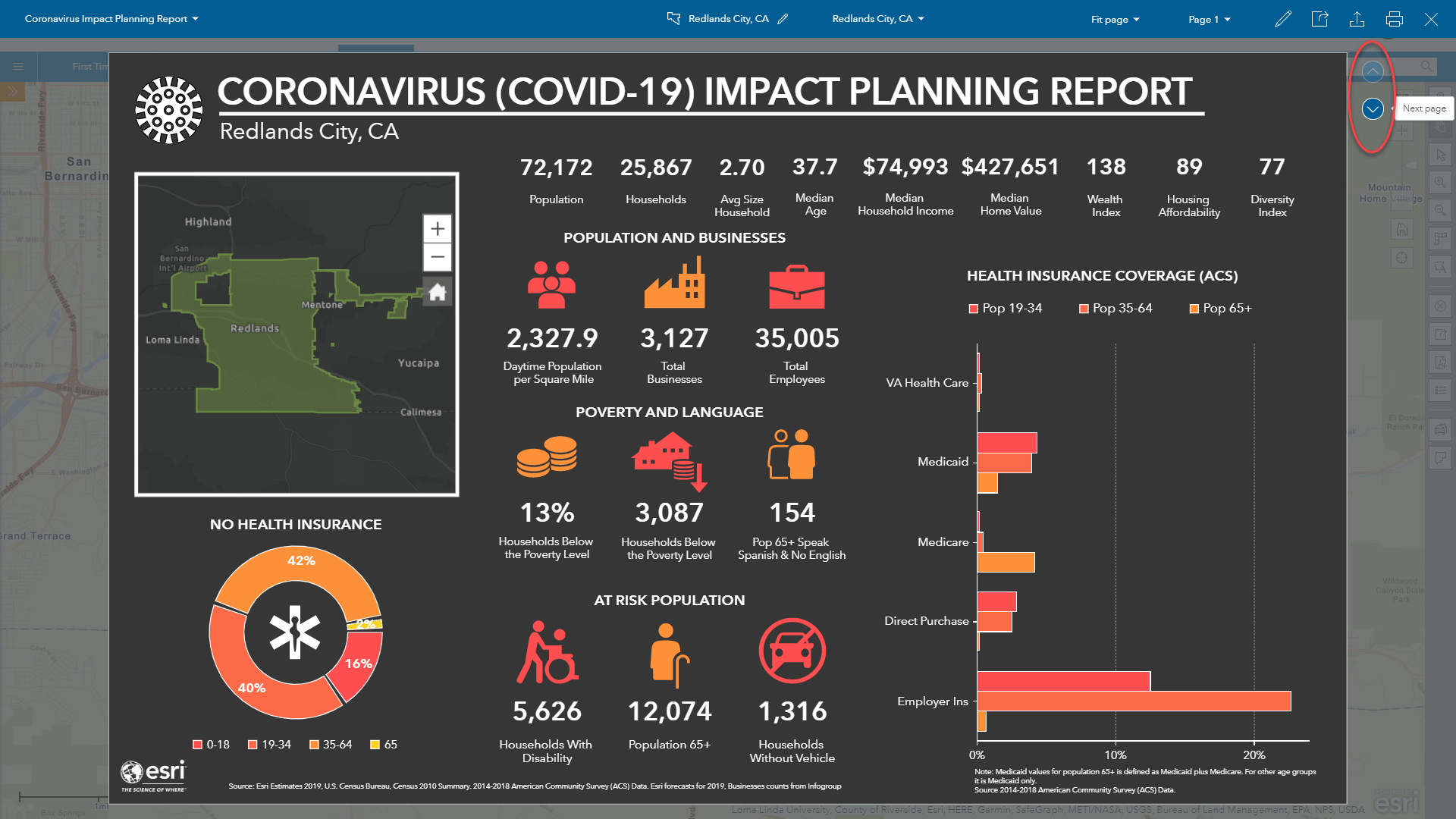 The infographic will now be generated, and all the charts, tables and panels populated with specific insights for the City of Redlands. The infographic has two pages so you can explore the second page of insights using the navigation buttons on the right-hand side of the infographic view.