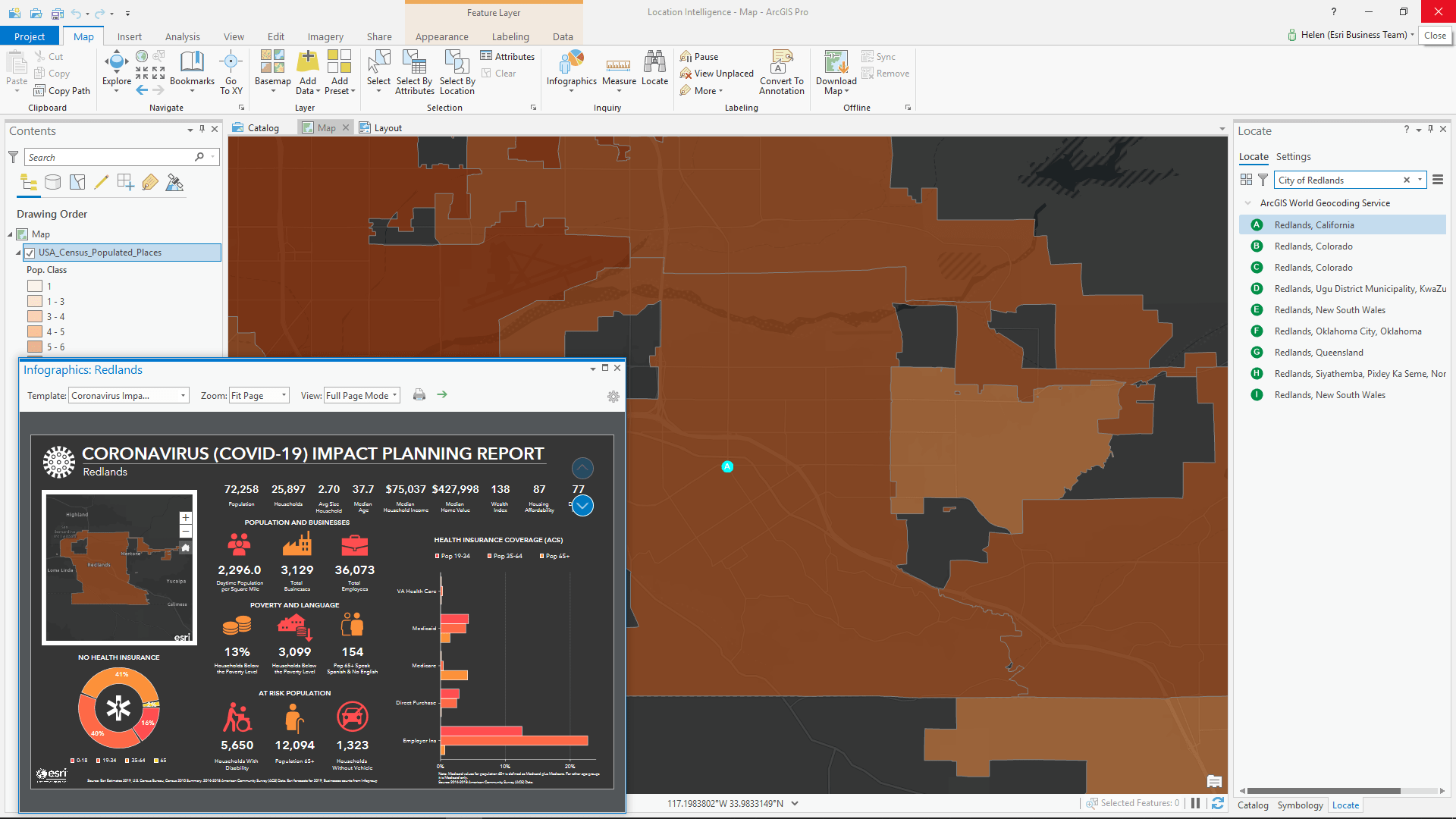 To use the Coronavirus infographic in ArcGIS Pro navigate to your area of interest and add the appropriate layers or features to the map. You can use the USA Census Populated Places layer to find the same City of Redlands boundary used in the BA Web search example shown above.