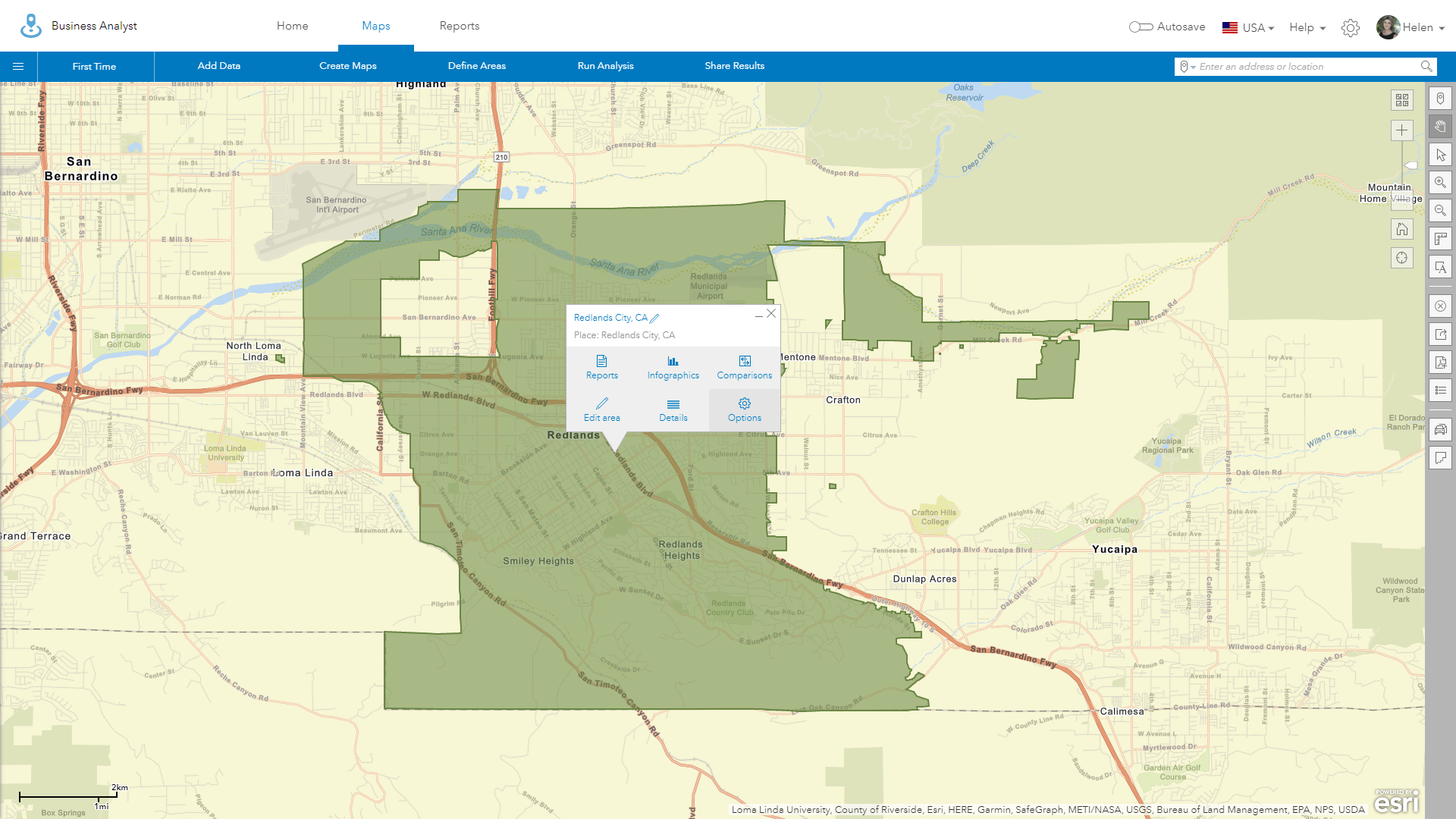 You will notice the map section in the infographic shows the City of Redlands in green, the default color defined in user settings for Select Geography. To change the color onscreen and in your infographic, exit the infographic viewer using the X – Close button at the top right to return to the map view.
