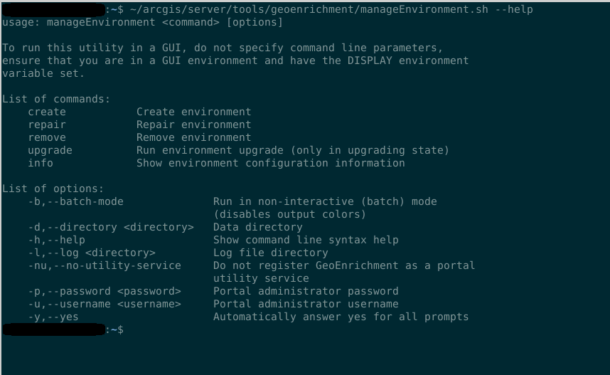 Creating the server environment can be accomplished in console mode with the Manage Environment tool. This tool publishes the GeoEnrichment service and creates an empty database which we’ll load data to in the next step. Here’s a look at the parameters of this tool. For example usage, please refer to the setup guide.