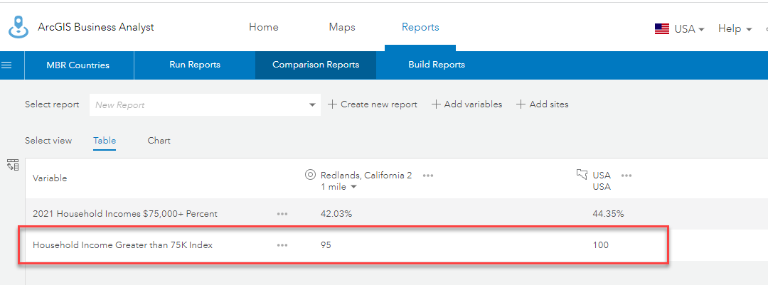 - The USA is added in the comparison report. As you can see, 44.35% of households in the USA have income $75,000 or higher. Write down the number down “0.4435” because it is needed to create the index variable.