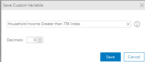 - Enter a custom variable name, Household Income Greater than 75K Index.