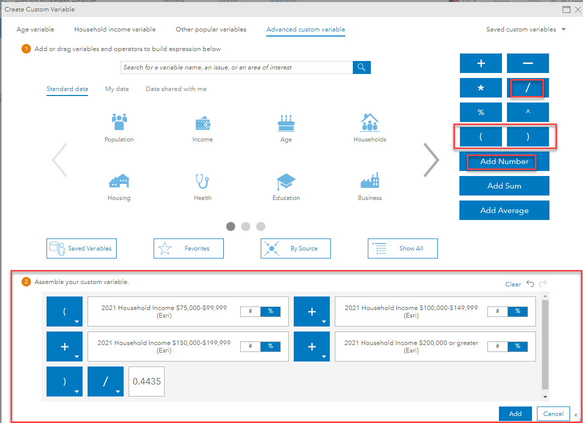 Business Analyst makes it simple to create some of the most popular custom variables for age, household income, home value, housing units, and race. The application also has a straightforward process to guide you through creating more advanced custom variables using mathematical operators and easy ways to add numbers and calculate sums and averages.