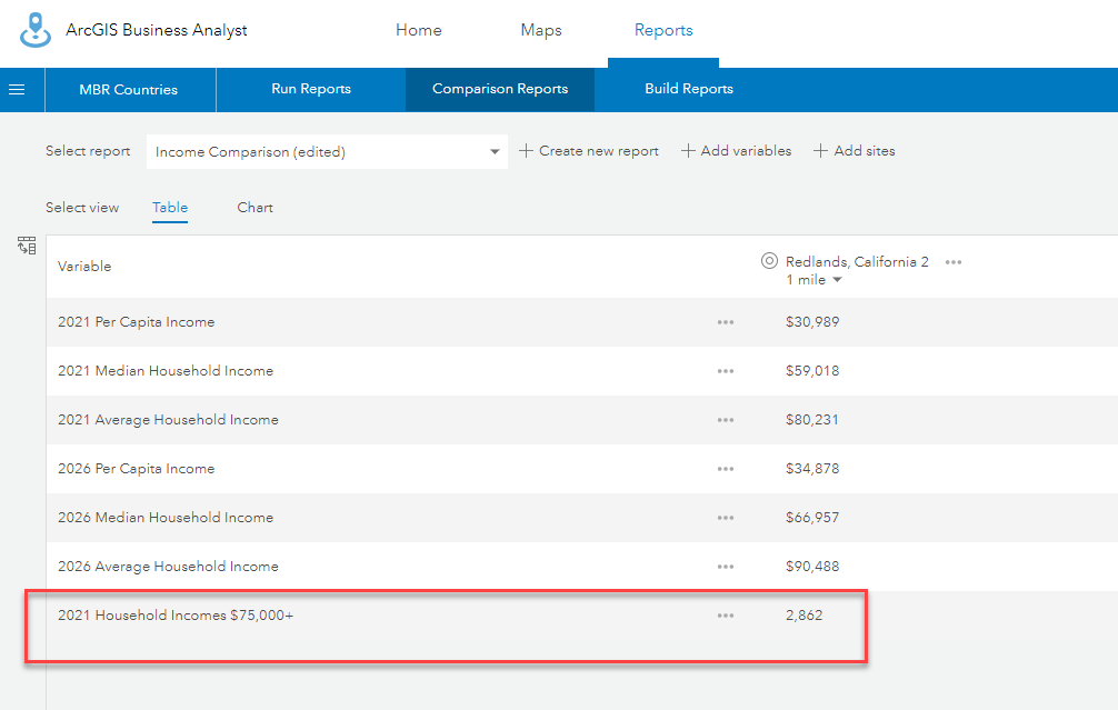 - To create the household income index variable, we’ll use the new percentage variable to determine the percentage of households with income greater than $75K for the whole country. This is easily accomplished in the comparison reports workflow.