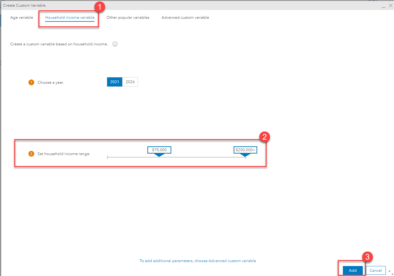 To create the custom household income variable in the Comparison Reports workflow, do the following: