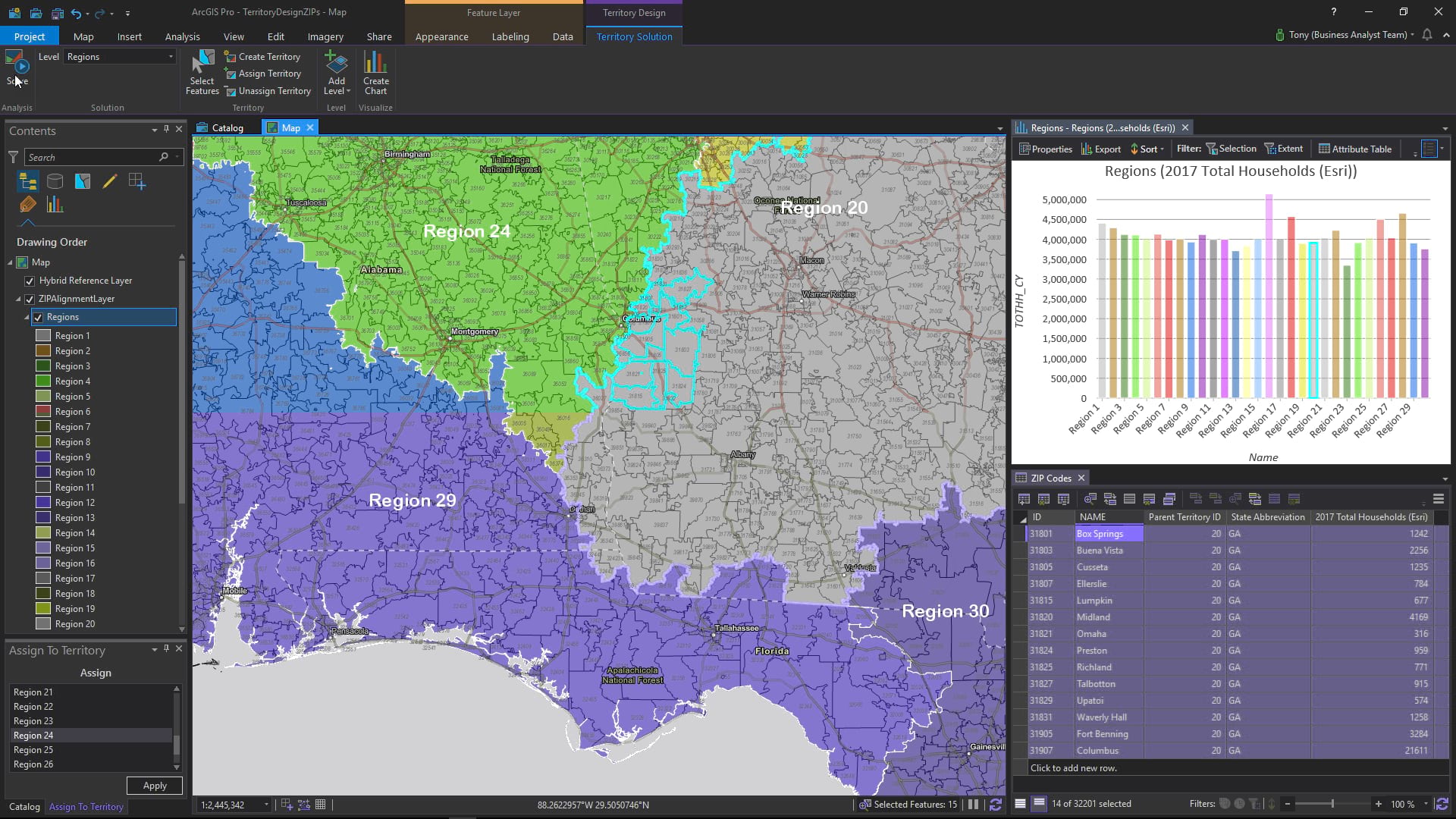 With the second workflow, users can interactively create and update their territories. They can modify or “fine tune” territories using a number of panel, ribbon, and map-based tools alongside attribute layers and charts. After territories have been created or updated, they can be shared as paper maps, PDFs, web maps, tables, and more!