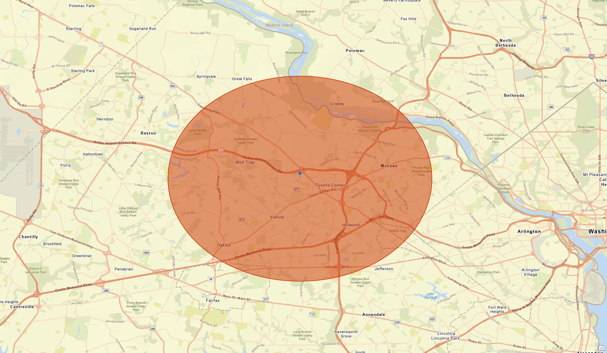 Business Analyst users regularly use rings to depict a trade area for a business or organization. The Generate Approximate Drive Times tool offers further insight into the ring and how people move about within it. For example, Figure 1 shows a five-mile ring around Esri’s Vienna, VA office: