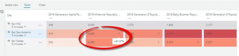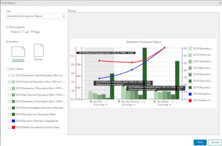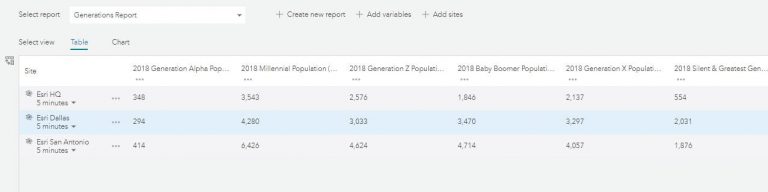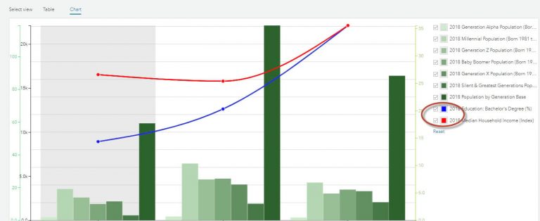 Continuing with our previous Generations report, select the Chart view. Now, I would like to show you a remarkable chart magic trick to impress your colleagues. Unlike other magicians, I am perfectly willing to share how to perform this magic trick and don’t worry, no live rabbits are used. The magic is made by adding an index or percent variable to the chart. To perform the trick, just click Add variables and select the 2018 Median Household Income Index and the 2018 Education: Bachelor’s Degree Percent and apply them to the report. Now, the chart magic begins. Notice how the variables are dynamically added to the chart. Impressive right?