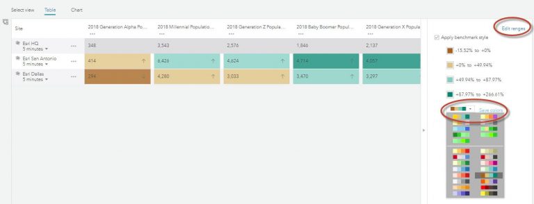 You can easily change the benchmark color style and edit the ranges in the right panel. To change benchmark colors, click the dropdown arrow below the color ramp boxes to select another color scheme or click the individual color boxes to create your own color scheme. The color changes are dynamically updated in the table. Save the colors if you would like to use them again in other reports. Default Benchmark style colors can be set in Preferences. Interactively edit ranges from this panel to get your desired custom report. You can always click reset to go back to the previous colors or default ranges.