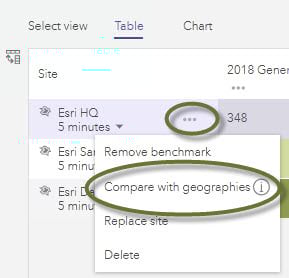 From the Table view you can compare a site with the geographies it lies in by a single click. Click Compare with geographies on the site action icon to view a comparison of the site with the geographies.
