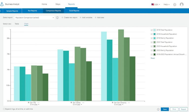 In this image, I customized the standard Esri Population Comparison report by adding the Population Annual Growth variable and changed the 2018 data variables to shades of blue. This edited standard report can be saved to use again.