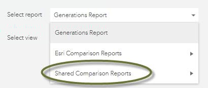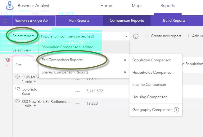 One of your old favorite features from the previous Comparison Report is the popular quick view Esri starter reports. These Esri Comparison Reports are still available; only now, the reports have an updated appearance with interactive enhancements. The first time New Comparison Reports is used, it will open to the Esri Population Comparison report and subsequently will open to your most recently used comparison report.