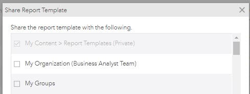 The Share Report Template dialog will open, and you can select to share the report with your entire organization or with individual groups.